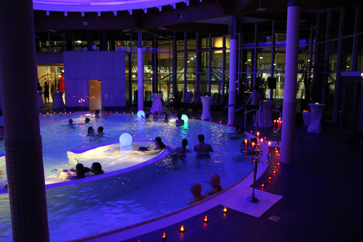 Kurz vor dem Valentinstag fand im Panorama-Bad Freudenstadt ein romantisches Candle-Light-Schwimmen statt. Dazu wurde der Erlebnisbereich in gedämpftes Licht und Kerzenschein getaucht. Der passionierte Musiker und Wirt Tilo Lutz vom Alban in Bad Rippoldsau-Schapbach sorgte für die passende musikalische Umrahmung. Die Badegäste konnten bei Sekt und Häppchen, was im Preis inbegriffen war, sanft im Wasser dahin schwelgen.
